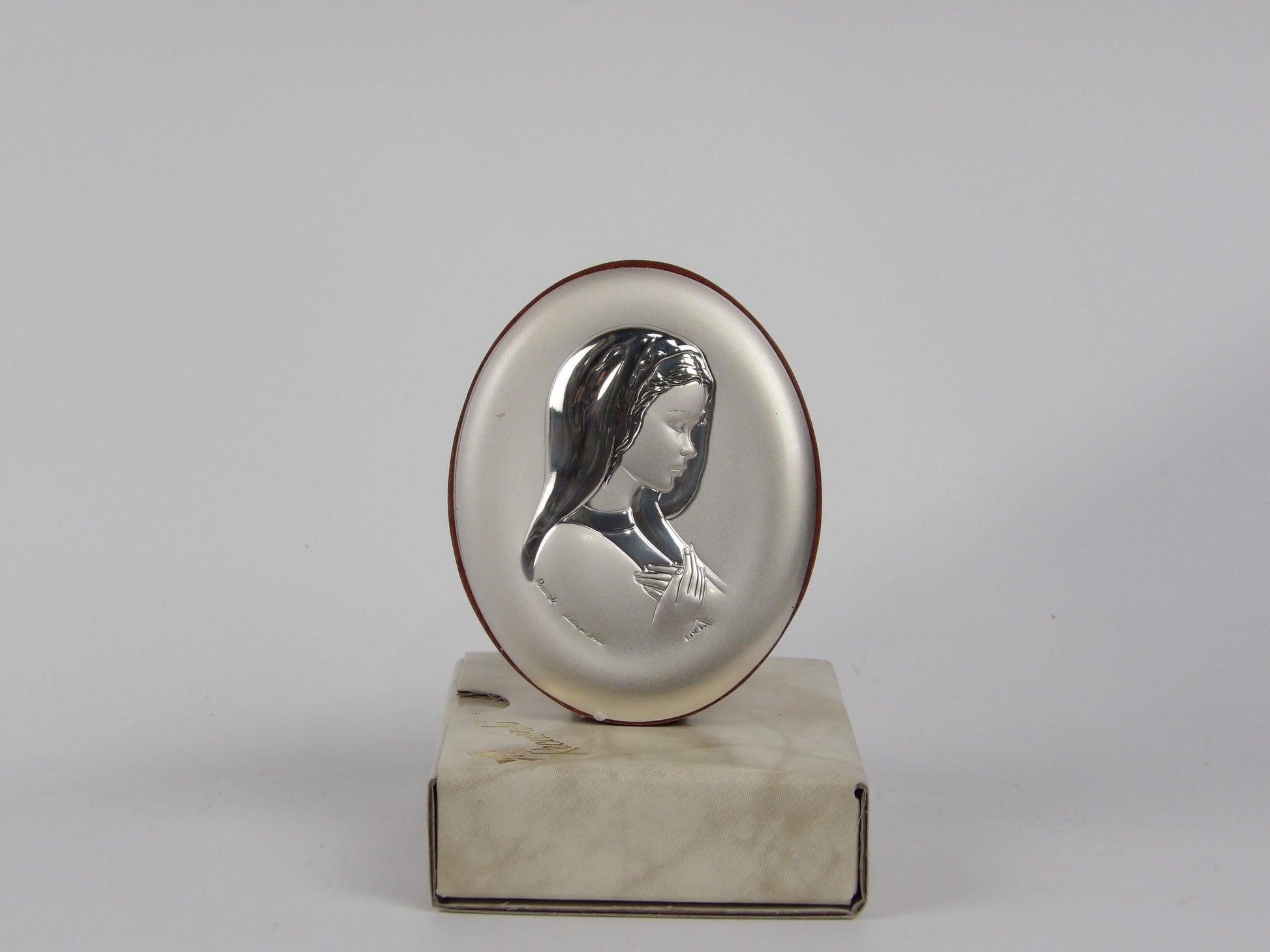 Esta elegante Virgen sobre laminado ovalado de plata está montada sobre una lujosa base de caoba, elaborada a mano por artesanos italianos de Linea Argenti. Los exquisitos detalles de la Virgen María en radiante laminado de plata realzan su expresión serena y apacible, convirtiéndola en una impresionante pieza de arte religioso.