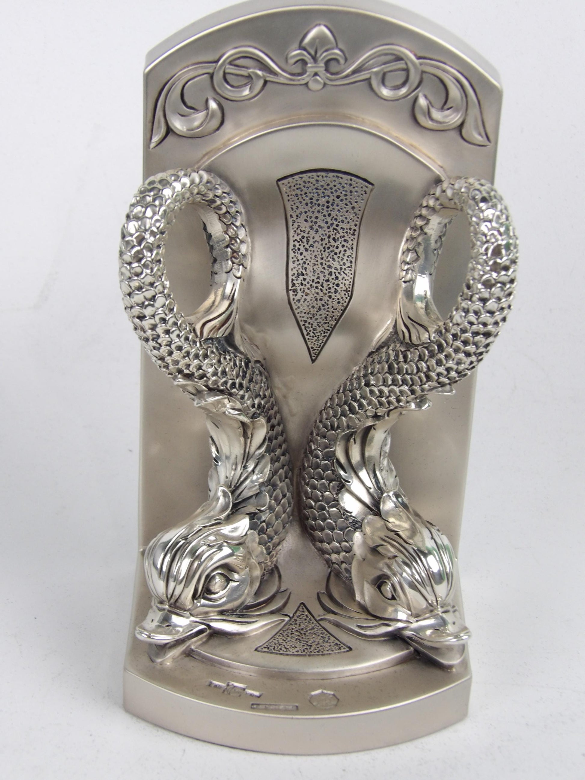 Hecho a mano en Italia por un artesano de Linea Argenti, este sujetalibros de resina plateada presenta un hermoso diseño de dos peces. Su elegante artesanía y su suave acabado plateado lo convierten en una pieza funcional y decorativa para cualquier estantería o decoración del hogar.