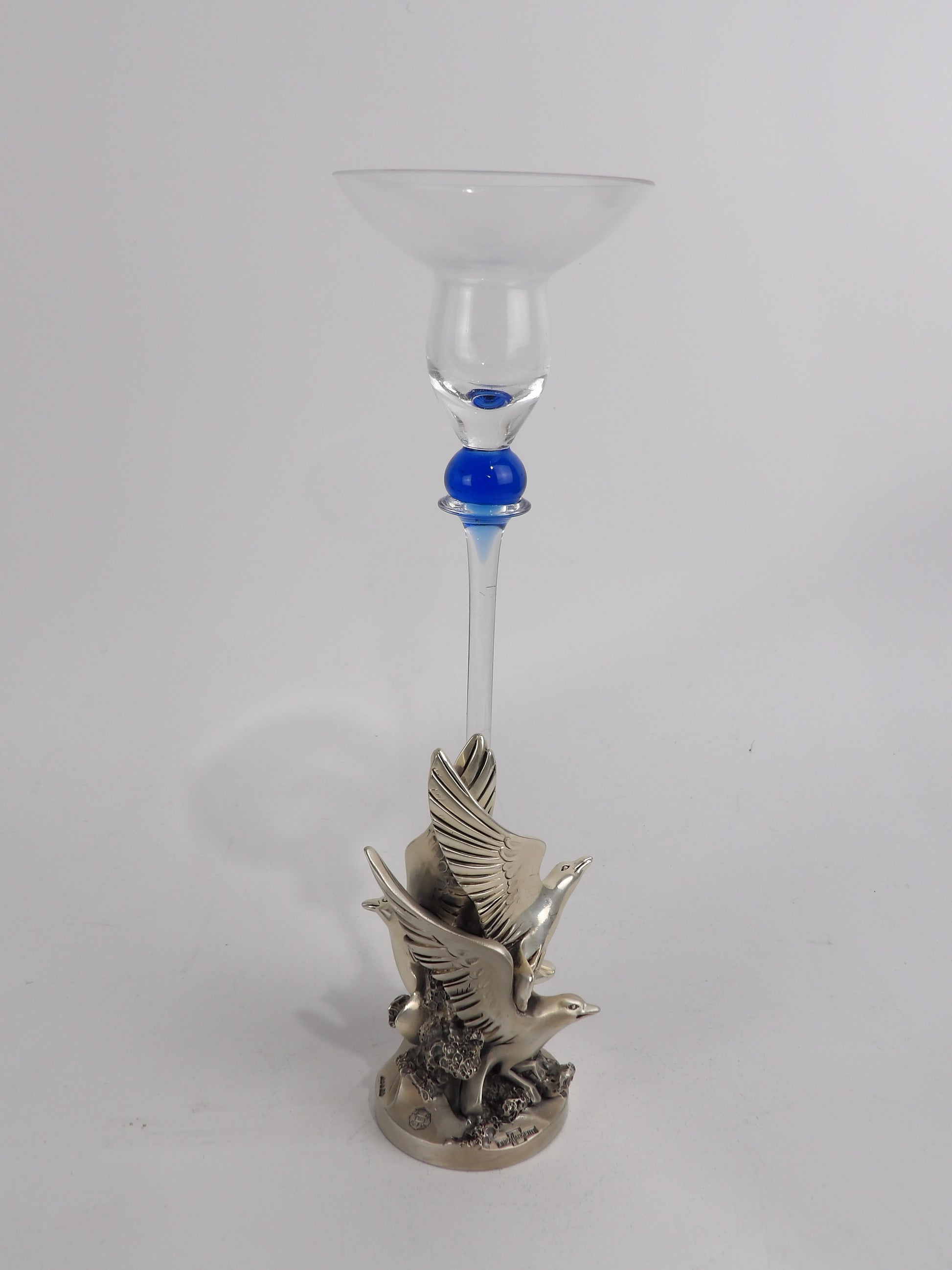 Crystal Candle Holder with Blue Glass Accent and Silver Bird Base – Exquisite Italian Design